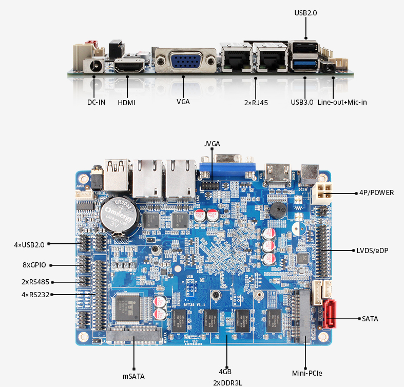 VGA+HDMI+eDP or LVDS, supports multiple display and gives you an extraordinary visual experience.