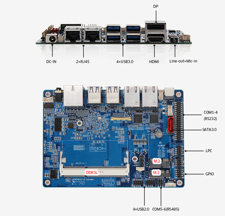 This board features multiple display via 1×Display Port1.2 and 1×HDMI1.4 and 1×eDP. It carries 1×DDR3L 1600 MHz slot up to 8GB to add higher bandwidth and lower latencies for processes. It has 2×10M/100M/1000M BASE-T gigabit LAN (Intel i211), 4×USB3.0, 4×USB2.0, 4×RS232, 2×RS485, 1×LPC(optional), 8×GPIO.