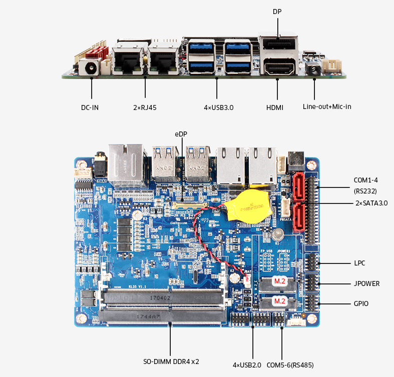 This board features multiple display via 1×Display Port1.2 and 1×HDMI1.4  and 1×eDP. It carries 2×DDR4 SO DIMM 2133MHz slots up to 32GB to add higher bandwidth and lower latencies for processes. It has 2×10M/100M/1000M BASE-T gigabit LAN (Intel i211/i219), 4×USB3.0, 4×USB2.0, 4×RS232, 2×RS485, 1×LPC(optional), 8×GPIO.